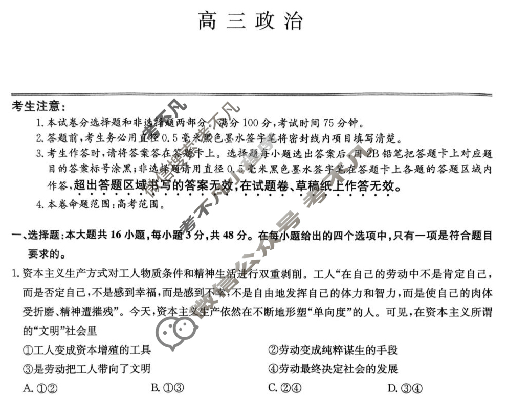 资源详情:[九师联盟]2025届高三1月质量检测巩固卷(角标含G)政治N-G试题 中内容包括《[九师联盟]2025届高三1月质量检测巩固卷(角标含G)政治N-G试题》请在考不凡上搜索。高三政治考生注意:1.本试卷分选择题和非选择题两部分。满分100分,考试时间75分钟。2.答题前,考生务必用直径0.5毫米黑色墨水签字笔将密封线内项目填写清楚。3.考生作答时,请将答案答在答题卡上。选择题每小题选出答案后,用2B铅笔把答题卡上对应题目的答案标号涂黑;非选择题请用直径0.5毫米黑色墨水签字笔在