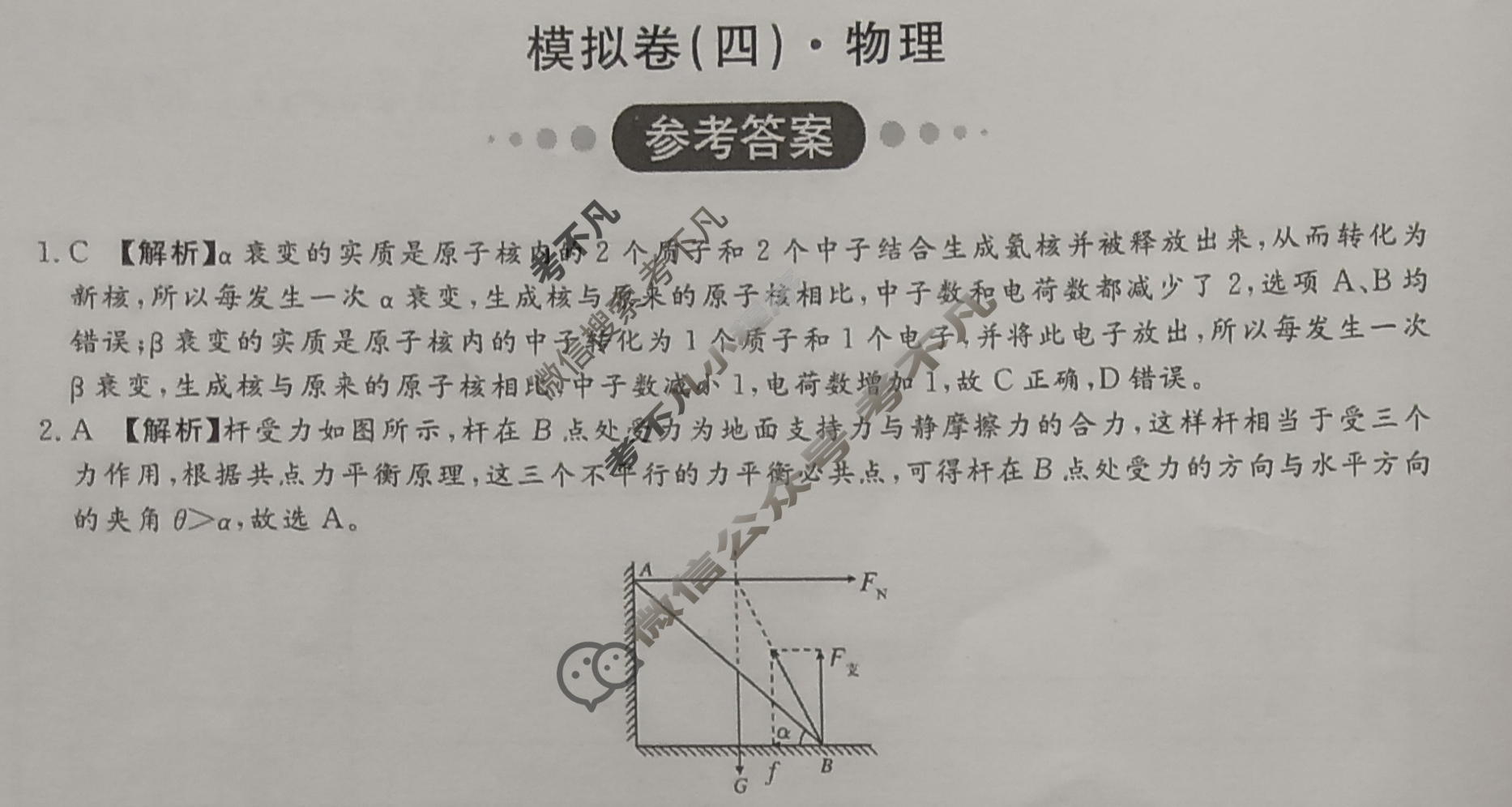 资源详情:[开卷文化]2025普通高中学业水平选择性考试模拟卷 新教材(四)4物理HN答案 中内容包括《[开卷文化]2025普通高中学业水平选择性考试模拟卷新教材(四)4物理HN答案》请在考不凡上搜索。模拟卷(四)·物理6.D【解析】线框中产生正弦式交支电流,方句周期性变化,故A错误:2时割=0,因此感应电流为△z参考答案●●零,安培力为率,根据平街条件,老线的在力F=mg,故B错买:0~哥时间内品-2跟一组,根据法拉△tTT1.C【解析】。衰变的实质是原子核内的2个质子和2个中子结合生成氨核并被