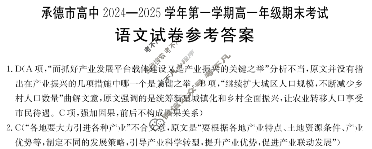 资源详情:金太阳承德市高中2024-2025学年第一学期高一年级期末考试(25-246A)语文答案 中内容包括《金太阳承德市高中2024-2025学年第一学期高一年级期末考试(25-246A)语文答案》请在考不凡上搜索。承德市高中2024一2025学年第一学期高一年级期末考试语文试卷参考答案1.D(A项,“而抓好产业发展平台载体建设又是产业振兴的关键之举”分析不当,原文并没有指出在产业振兴的几项措施中哪一个是关键之举。B项,“继续扩大城区人口规模,不断减少乡村人口数量”曲解文意,原文强调的是统筹新型城镇化