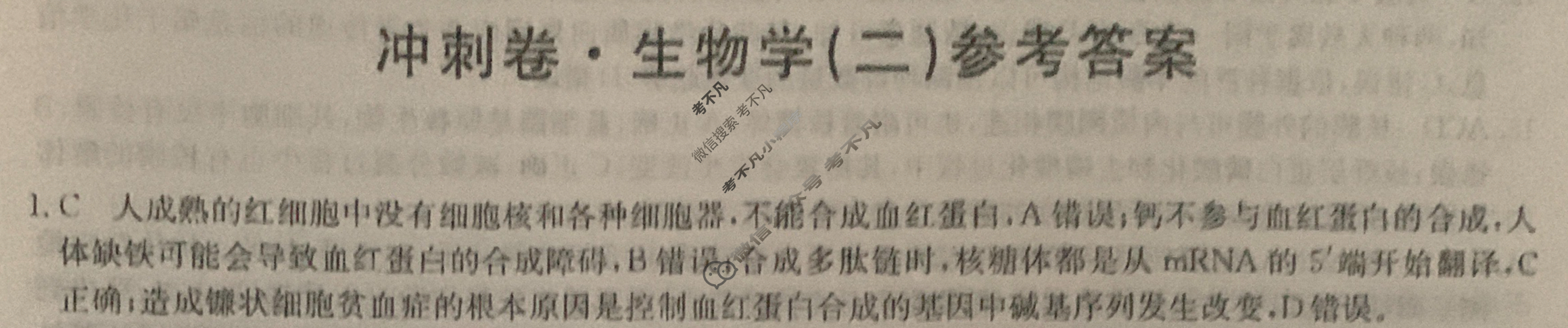 资源详情:高三2024年江西省普通高中学业水平选择性考试·冲刺押题卷(新高考 江西)(二)2生物(江西)答案 中内容包括《高三2024年江西省普通高中学业水平选择性考试·冲刺押题卷(新高考江西)(二)2生物(江西)答案》请在考不凡上搜索。冲刺卷·生物学(二)参考答案1,C人成熟的红细胞中没有细胞核和各种细胞器,不能合成血红蛋自,A错误;钙不参与血红激有的合成,人体缺铁可能会导致血红蛋白的合成障碍,B错误;合成多肽值国,核糖休都是从mRNA的5端开始翻译,C正确,造成镰状细胞贫血症的根本原因是控制血红蛋白合成的基因中