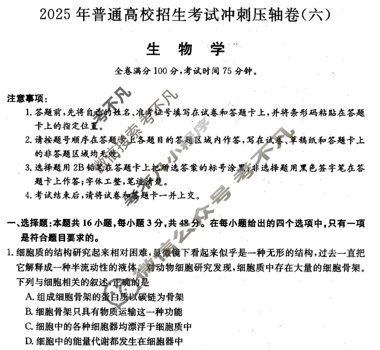 分类:2025年,冲刺压轴卷,六,生物(H),普通高校招生考试冲刺压轴卷