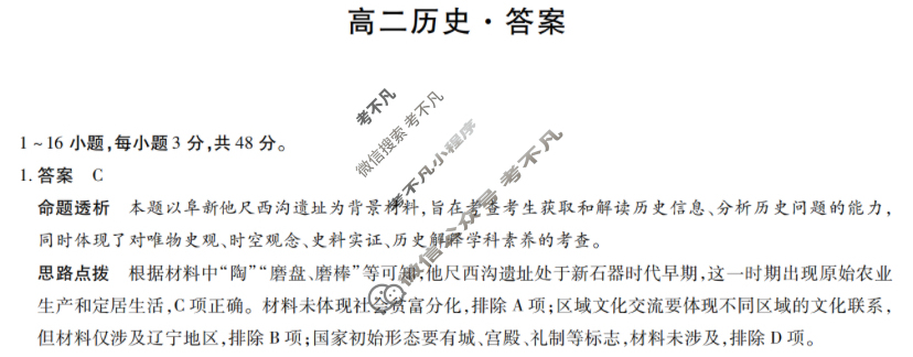 资源详情:[天一大联考]湖南省2024-2025学年高二联考(11月)历史答案 中内容包括《[天一大联考]湖南省2024-2025学年高二联考(11月)历史答案》请在考不凡上搜索。高二历史·答案1~16小题,每小题3分,共48分。1.答案C命题透析本题以阜新他尺西沟遗址为背景材料,旨在考查考生获取和解读历史信息、分析历史问题的能力,同时体现了对唯物史观、时空观念、史料实证、历史解释学科素养的考查。思路点拨根据材料中“陶”“磨盘、磨棒”等可知,他尺西沟遗址处于新石器时代早期,这一时期出现