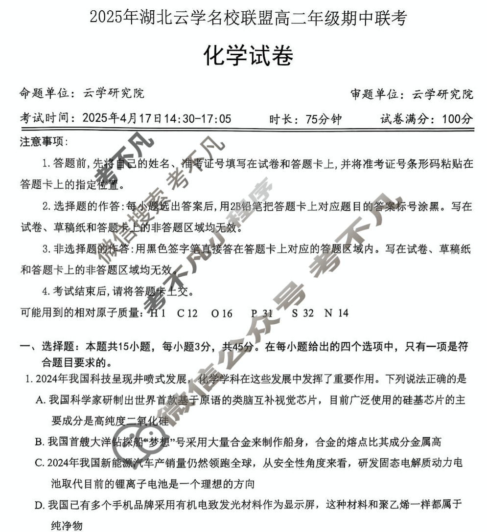 资源详情:2025年湖北云学名校联盟高二期中联考(4月)化学试题 中内容包括《2025年湖北云学名校联盟高二期中联考(4月)化学试题》请在考不凡上搜索。2025年湖北云学名校联盟高二年级期中联考化学试卷命题单位:云学研究院审题单位:云学研究院考试时间:2025年4月17日14:30-17:05时长:75分钟试卷满分:100分注意事项1.答题前,先将自己的姓名、准考证号填写在试卷和答题卡上,并将准考证号条形码粘贴在答题卡上的指定位置。2.选择题的作答:每小题选出答案后,用2
