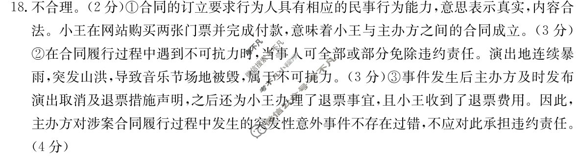 资源详情:吉林省2023-2024学年高二金太阳5月联考(正方形包菱形)政治答案 中内容包括《吉林省2023-2024学年高二金太阳5月联考(正方形包菱形)政治答案》请在考不凡上搜索。高二思想政治试卷参考答案1.D2.B3.C4.C5.C6.A7.A8.D9.D10.A11.C12.B13.B14.A15.B16.B17.(1)发明人取得专利权证书后,是受国家法律保护的发明专利权人,他人未经专利权人同意,不得使用专利权人享有专利的发明创造。(4分)G是某礼仪花盘实用新型专利和外观设计专利