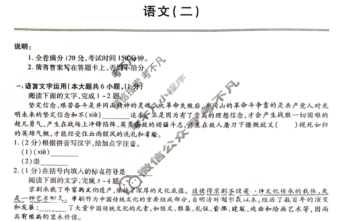 资源详情:初中2025年江西省中考模拟信息冲刺卷(二)2语文试题 中内容包括《初中2025年江西省中考模拟信息冲刺卷(二)2语文试题》请在考不凡上搜索。2025年江西省中考模拟信息冲刺卷语文(二)说明:1.全卷满分120分,考试时间150分钟。2.请将答案写在答题卡上,否则不给分。一:语言文字运用(本大题共6小题,11分)阅读下面的文字,完成1~2题。坚定信念、艰苦奋斗是井冈山精神的灵魂。大革命失败后,井冈山的革命斗争靠的是共产党人对光明未来的坚定信念和不(è)追求。正是