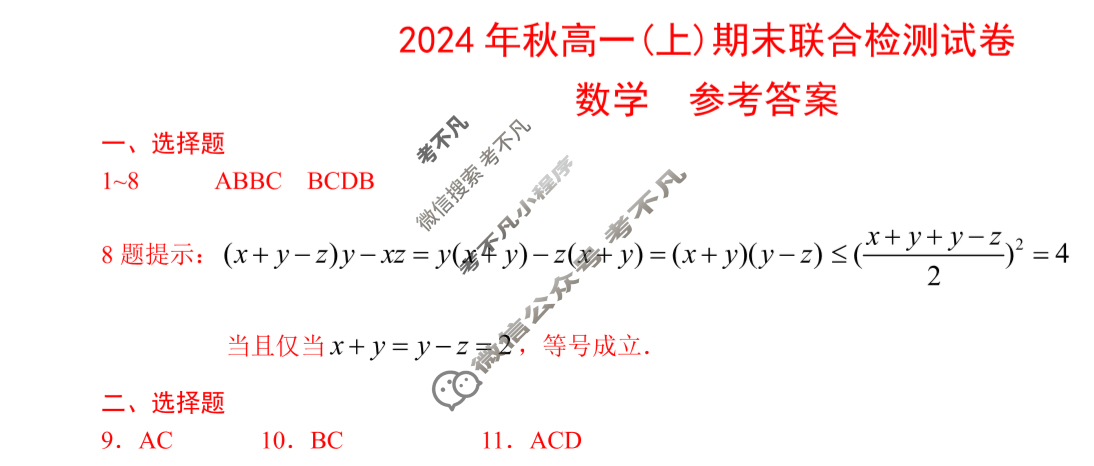 资源详情:[重庆康德]2024年秋高一(上)期末联合检测试卷数学答案 中内容包括《[重庆康德]2024年秋高一(上)期末联合检测试卷数学答案》请在考不凡上搜索。2024年秋高一(上)期末联合检测试卷数学参考答案一、选择题1~8ABBCBCDB8题提示:(x+y-2y-z=y(x+y)-z(x+)=(x+0y-2)≤(心+y+y-马}?=42当且仅当x+y=y-z=2,等号成立.二、选择题9.AC10.BC11.ACD11题提示:A选项:当x2、),有f(-x)+g(-x)=l