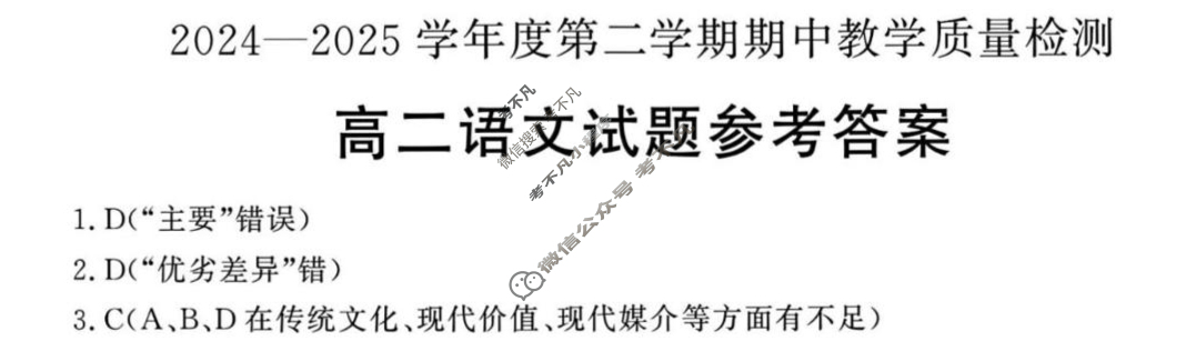 资源详情:聊城市2024-2025学年高二第二学期期中教学质量检测语文答案 中内容包括《聊城市2024-2025学年高二第二学期期中教学质量检测语文答案》请在考不凡上搜索。2024一2025学年度第二学期期中教学质量检测高二语文试题参考答案1.D(“主要”错误)2.D(“优劣差异”错)3.C(A、B、D在传统文化、现代价值、现代媒介等方面有不足)4.①符号阐释不同:《哪吒2》以动画电影为媒介,观众以被动接受为主,互动性相对较弱;《黑神话:悟空》以游戏为媒介,通过游戏的互动,让玩家主