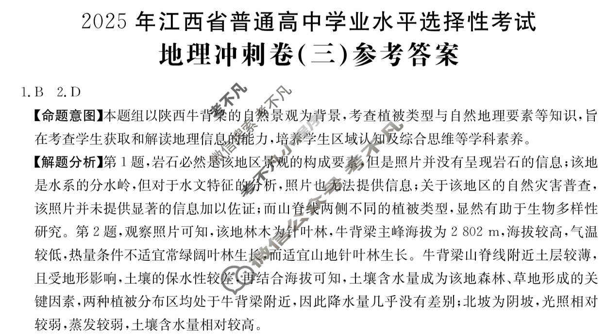 资源详情:2025年江西省普通高中学业水平选择性考试100所名校高考冲刺卷·地理(三)3[25·(新高考)CCJ·地理·JX]答案 中内容包括《2025年江西省普通高中学业水平选择性考试100所名校高考冲刺卷·地理(三)3[25·(新高考)CCJ·地理·JX]答案》请在考不凡上搜索。全国100所名校高考冲刺卷於2025年江西省普通高中学业水平选择性考试地理冲刺卷(三)参考答案1.B2.D【命题意图】本题组以陕西牛背梁的自然景观为背景,考查植被类型与自然地理要素等知识,旨在考查学生获取和解读地理信息的能力,培养学生区域认知及综合思维等学科