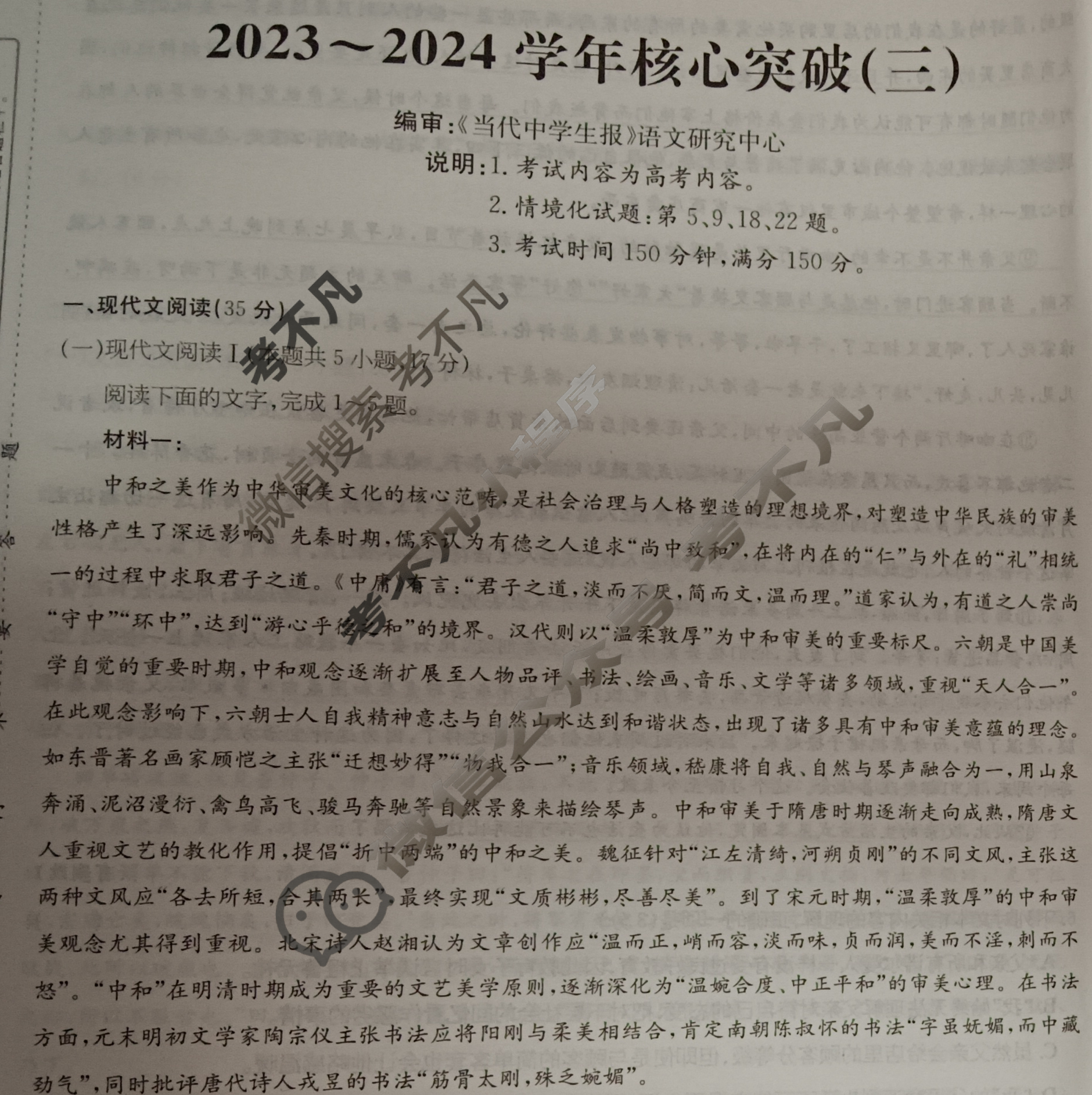 资源详情:2023~2024学年核心突破XGK(三)3语文试题 中内容包括《2023~2024学年核心突破XGK(三)3语文试题》请在考不凡上搜索。2023~2024学年核心突破(三)想原则或方法论原则一中庸。孔子说:“中庸之为德也,其至矣乎!民鲜久矣”“执两用中”是思想法斯,也是方法论法则。它的主要内容和特征,是以对中”的选取,追泉为目标的,“中”是对立因素或对立面之间编审:《当代中学生报》语文研究中心的正确之点,最佳之点,它不是国定的而是变动的,就好比释碗在秤杆上移