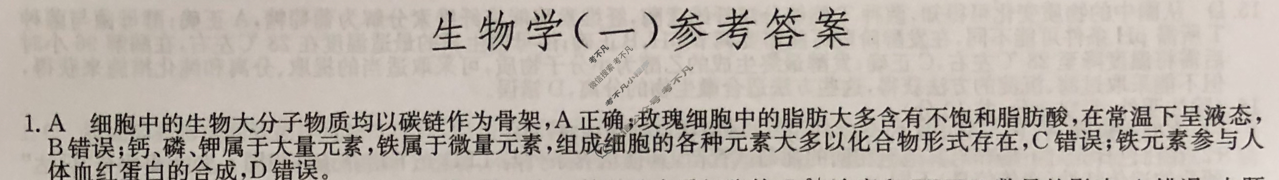 资源详情:[九师联盟]2024届高三押题信息卷(一)1生物(XKB-H)答案 中内容包括《[九师联盟]2024届高三押题信息卷(一)1生物(XKB-H)答案》请在考不凡上搜索。2024届高三押题信息卷生物学(一)参考答案1.A细胞中的生物大分子物质均以碳链作为骨架,A正确:玫瑰细胞中的脂肪大多含有不饱和脂肪酸,在常温下呈液态,B错误;钙、磷、钾属于大量元素,铁属于微量元素,组成细胞的各种元素大多以化合物形式存在,C错误;铁元素参与人体血红蛋白的合成,D错误2.TRPV6运输Ca2+的