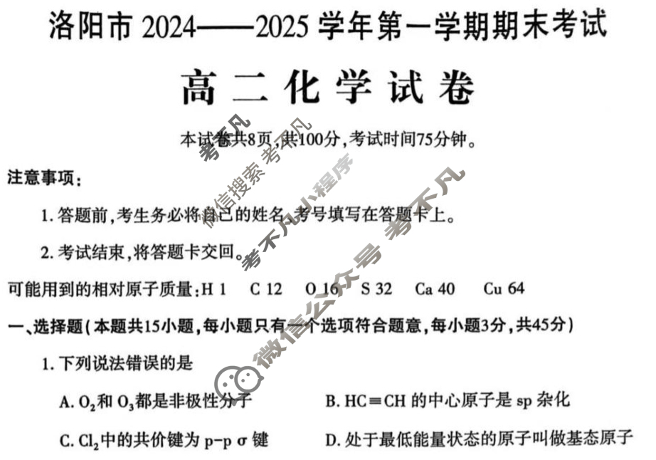 洛阳市2024-2025学年高二第一学期期末(1月)化学试题