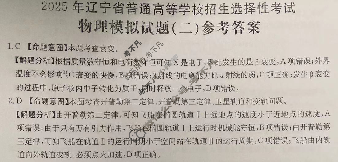 资源详情:2025年辽宁省普通高等学校招生选择性考试高考模拟示范卷·物理(二)2[25·(新高考)ZX·MNJ·物理·LN]答案 中内容包括《2025年辽宁省普通高等学校招生选择性考试高考模拟示范卷·物理(二)2[25·(新高考)ZX·MNJ·物理·LN]答案》请在考不凡上搜索。2025年辽宁省普通高等学校招生选择性考试物理模拟试题(二)参考答案1.C【命题意图】本题考查衰变。【解题分析】根据质量数守恒和电荷数守恒可知X是电子,因此发生的是阝衰变,A项错误;外界温度不会影响'C衰变的快慢,B项错误;β射线的电离能力比α射线的弱,C项正