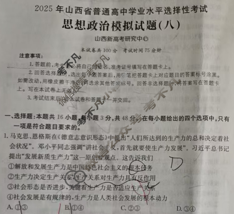 2025年山西省普通高中学业水平选择性考试高考模拟示范卷·思想政治(八)8[25·(新高考)ZX·MNJ·思想政治·SHX]试题