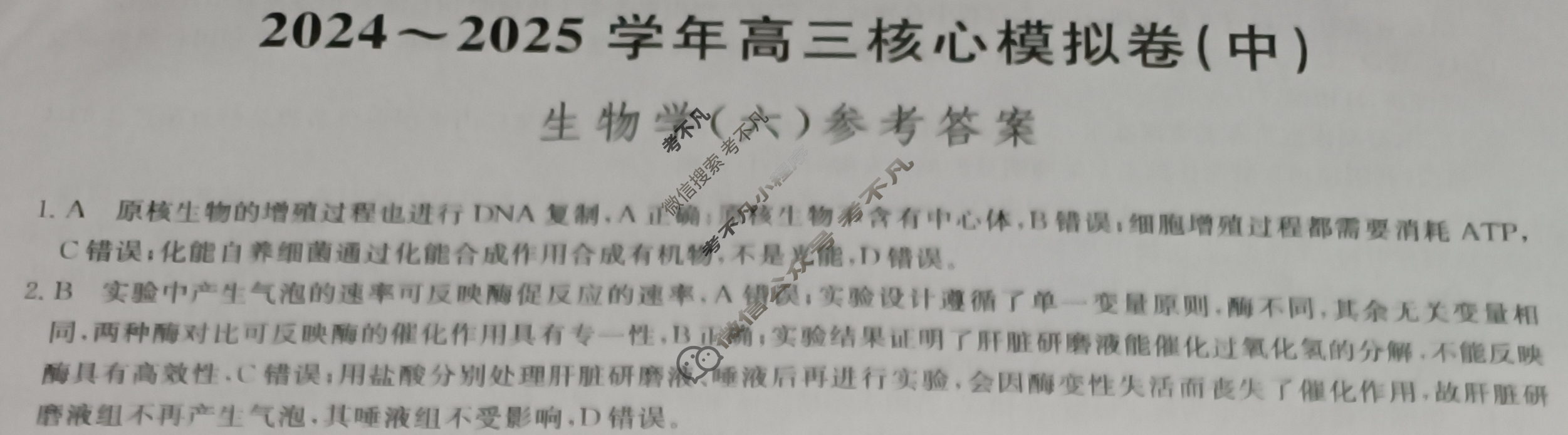 资源详情:[九师联盟]2024~2025学年高三核心模拟卷(中)·(六)6生物D2答案 中内容包括《[九师联盟]2024~2025学年高三核心模拟卷(中)·(六)6生物D2答案》请在考不凡上搜索。2024~2025学年高三核心模拟卷(中)生物学(六)参考答案1.A原核生物的增殖过程也进行DNA复制,A正确:原核生物不含有中心体,B错误,细胞增殖过程都需要消耗ATP,C错误,化能自养细菌通过化能合成作用合成有机物,不是光能D错误。2B实验中产生气泡的速率可反陕酶促反应的速率,A错误,实验设计遵循