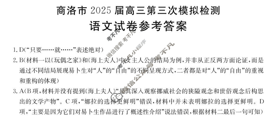 资源详情:商洛市2025届高三第三次模拟检测(3月)语文答案 中内容包括《商洛市2025届高三第三次模拟检测(3月)语文答案》请在考不凡上搜索。商洛市2025届高三第三次模拟检测语文试卷参考答案1.D(“只要…就…”表述绝对)2.B(材料一以《玩偶之家》和《海上夫人》中女主人公的结局为例,并非从正反两方面论证,而是通过不同结局展现易卜生对“人”的“自由”的不同呈现方式,二者都是对“人”的“自由”的重视和重构的体现)3.A(B项,材料并没有提到《海上夫人》“是其深入观察