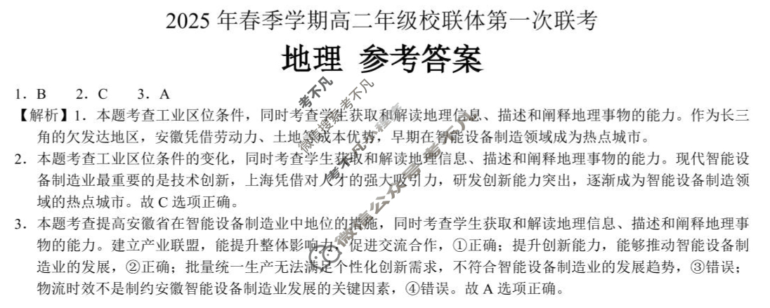 资源详情:广西2025年春季学期高二年级校联体第一次联考地理答案 中内容包括《广西2025年春季学期高二年级校联体次联考地理答案》请在考不凡上搜索。2025年春季学期高二年级校联体次联考地理参考答案1.B2.C3.A【解析】1.本题考查工业区位条件,同时考查学生获取和解读地理信息、描述和阐释地理事物的能力。作为长三角的欠发达地区,安徽凭借劳动力、土地等成本优势,早期在智能设备制造领域成为热点城市。2.本题考查工业区位条件的变化,同时考查学生获取和解读地理信息、描述和阐释地