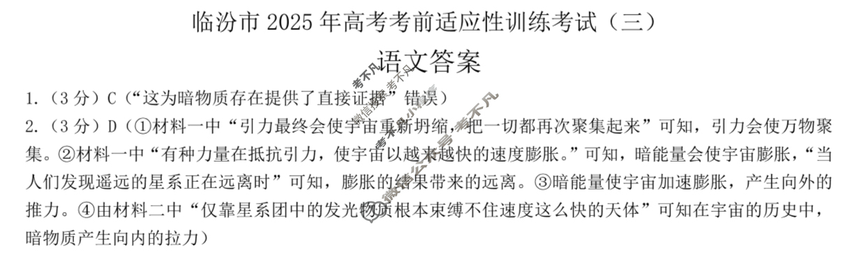 资源详情:临汾市2025年高考考前适应性训练考试(三)语文答案 中内容包括《临汾市2025年高考考前适应性训练考试(三)语文答案》请在考不凡上搜索。临汾市2025年高考考前适应性训练考试(三)语文答案1.(3分)C(“这为暗物质存在提供了直接证据”错误)2.(3分)D(①材料一中“引力最终会使宇宙重新坍缩,把一切都再次聚集起来”可知,引力会使万物聚集。②材料一中“有种力量在抵抗引力,使宇宙以越来越快的速度膨胀。”可知,暗能量会使宇宙膨胀,“当人们发现遥远的星系正在远离时