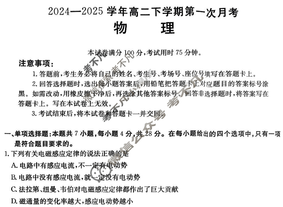 资源详情:河南金太阳2024-2025学年高二下学期第一次月考(3.19)物理B3试题 中内容包括《河南金太阳2024-2025学年高二下学期第一次月考(3.19)物理B3试题》请在考不凡上搜索。2024一2025学年高二下学期第一次月考物理本试卷满分100分,考试用时75分钟。注意事项:1.答题前,考生务必将自己的姓名、考生号、考场号、座位号填写在答题卡上。2.回答选择题时,选出每小题答案后,用铅笔把答题卡上对应题目的答案标号涂中黑。如需改动,用橡皮擦干净后,再选涂其他答案标号。回答非选择题
