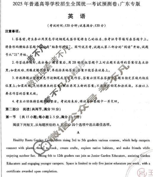 [王后雄教育]2025年普通高等学校招生全国统一考试预测卷英语(广东专版)试题