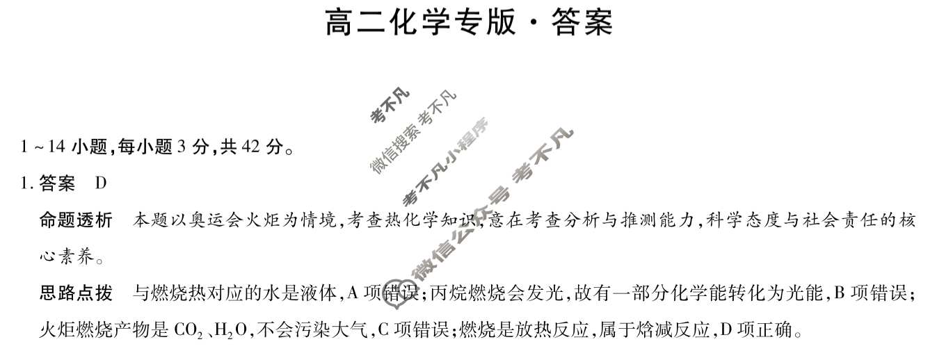 资源详情:[天一大联考]湖南省2024-2025学年高二联考(11月)化学专版答案 中内容包括《[天一大联考]湖南省2024-2025学年高二联考(11月)化学专版答案》请在考不凡上搜索。高二化学专版·答案1~14小题,每小题3分,共42分。1.答案D命题透析本题以奥运会火炬为情境,考查热化学知识,意在考查分析与推测能力,科学态度与社会责任的核心素养。思路点拨与燃烧热对应的水是液体,A项错误;丙烷燃烧会发光,故有一部分化学能转化为光能,B项错误;火炬燃烧产物是C02、H,0,不会污染大气,