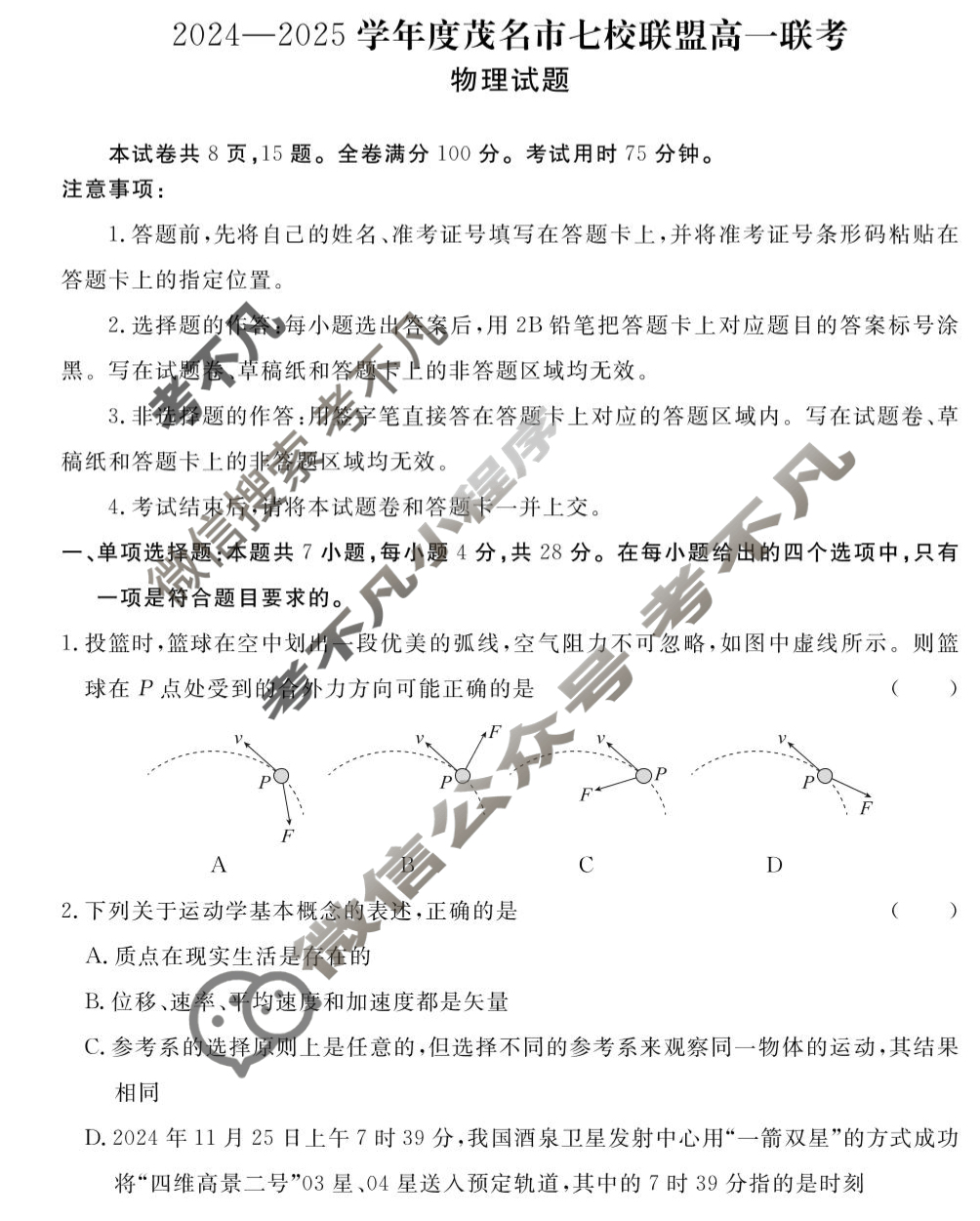 2024-2025学年度茂名市七校联盟高一联考物理试题