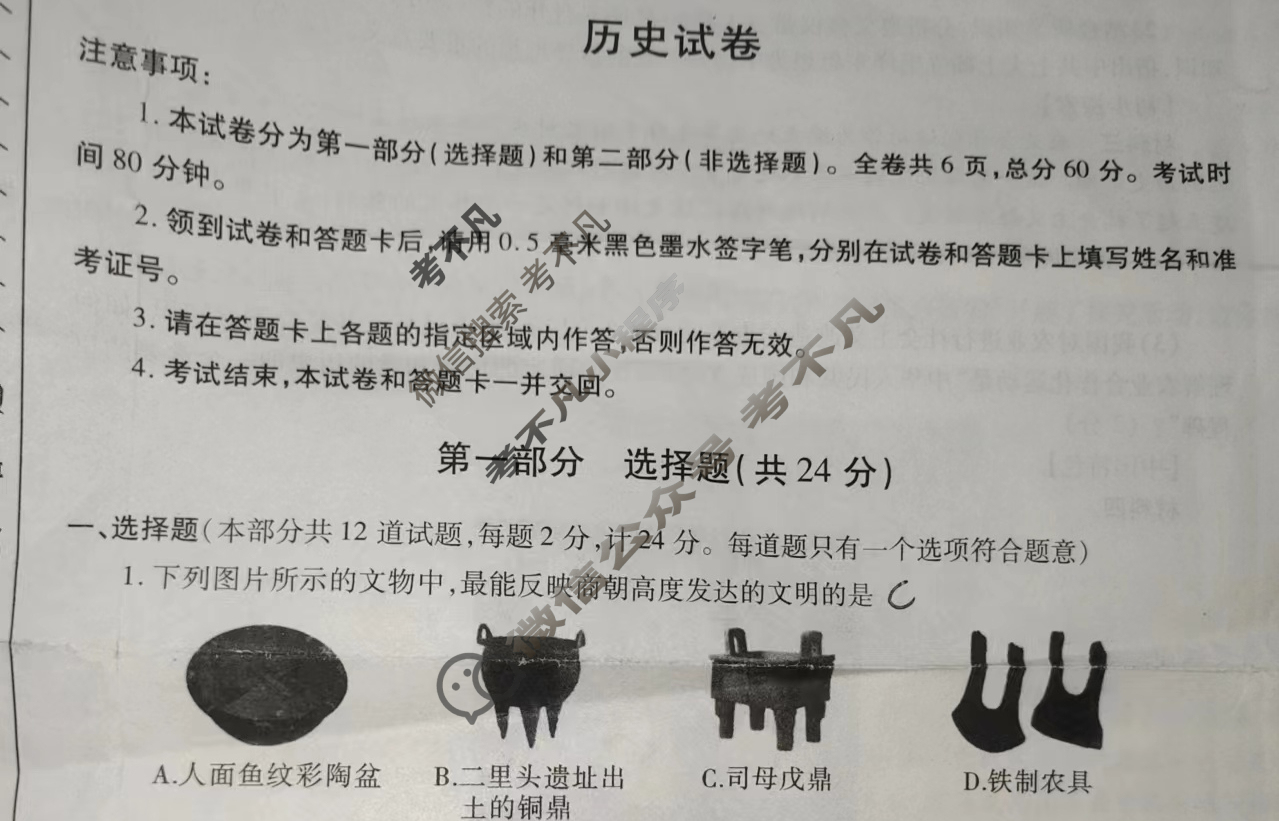 资源详情:2024年陕西省初中学业水平考试[SX4]历史试题 中内容包括《2024年陕西省初中学业水平考试[SX4]历史试题》请在考不凡上搜索。2024年陕西省初中学业水平考试注意事项:历史试卷1本试卷分为第一部分(选择题)和第二部分(非选择题)。全卷共6页,总分60分。考试时间80分钟。2.领到试卷和答题卡后,请用0.5毫米黑色墨水签字笔,分别在试卷和答题卡上填写姓名和准考证号。3.请在答题卡上各题的指定区域内作答,否则作答无效。4.考试结束,本试卷和答题卡一并交回