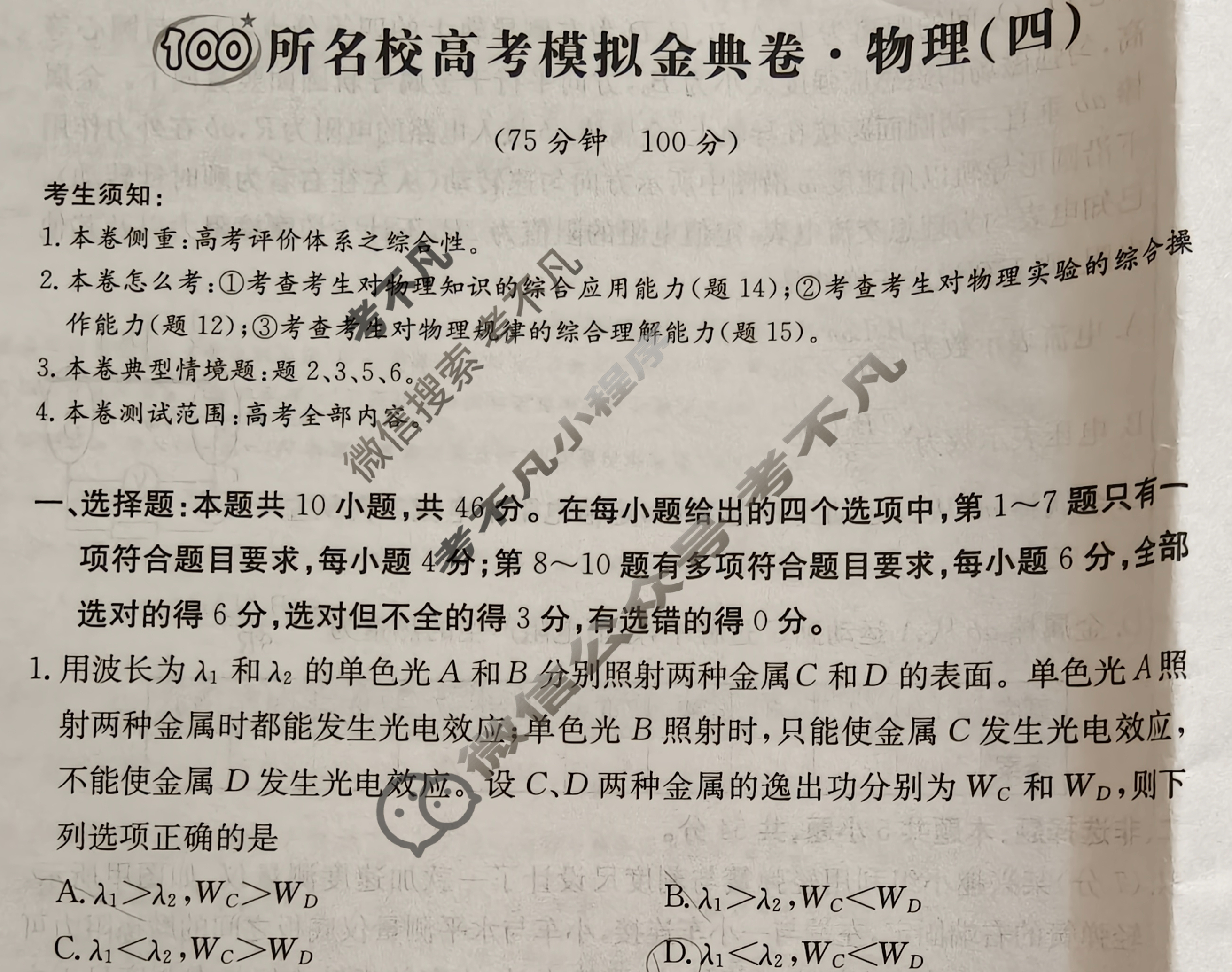 资源详情:2025年全国100所名校高考模拟金典卷·物理[25新高考·JD·物理-JX](四)4试题 中内容包括《2025年全国100所名校高考模拟金典卷·物理[25新高考·JD·物理-JX](四)4试题》请在考不凡上搜索。©©所名校高考模拟金典卷·物理(四)(75分钟100分)考生须知:1.本卷侧重:高考评价体系之综合性。2,本卷怎么考:①考查考生对物理知识的综合应用能力(题14):②考查考生对物理实验的综含操作能力(题12);③考查考生对物理规律的综合理解能力(题15)。3.本卷典型情境题:题2、3、5