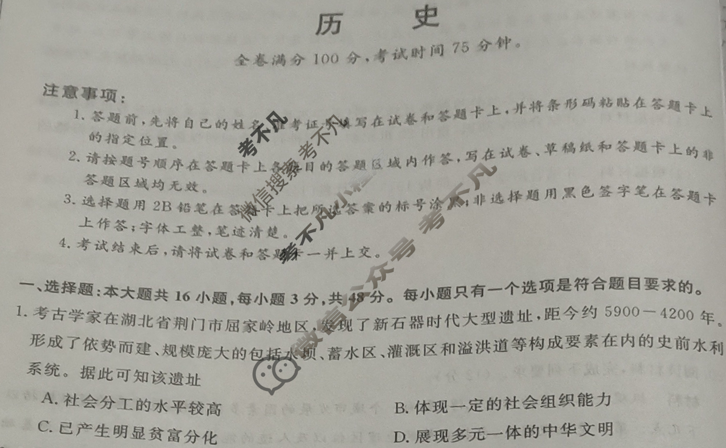 资源详情:高三2025年普通高校招生考试冲刺压轴卷(六)6历史E试题 中内容包括《高三2025年普通高校招生考试冲刺压轴卷(六)6历史E试题》请在考不凡上搜索。2025年普通高校招生考试冲刺压轴卷(六)历史金卷满分100分,考诚时间75分钟人5背,先并自已的丝名、准青征号填写在议套和答题卡上并特条形马粉心在参奥卡上注意事项:二亦龄题等痕办在都题卡上各题用的多题区收内作答,写在试客,草格低和答题卡上的理的指定位置。又选择题用B相笔在器题卡上北所越签食的标号涂深:非越择避用X色鉴