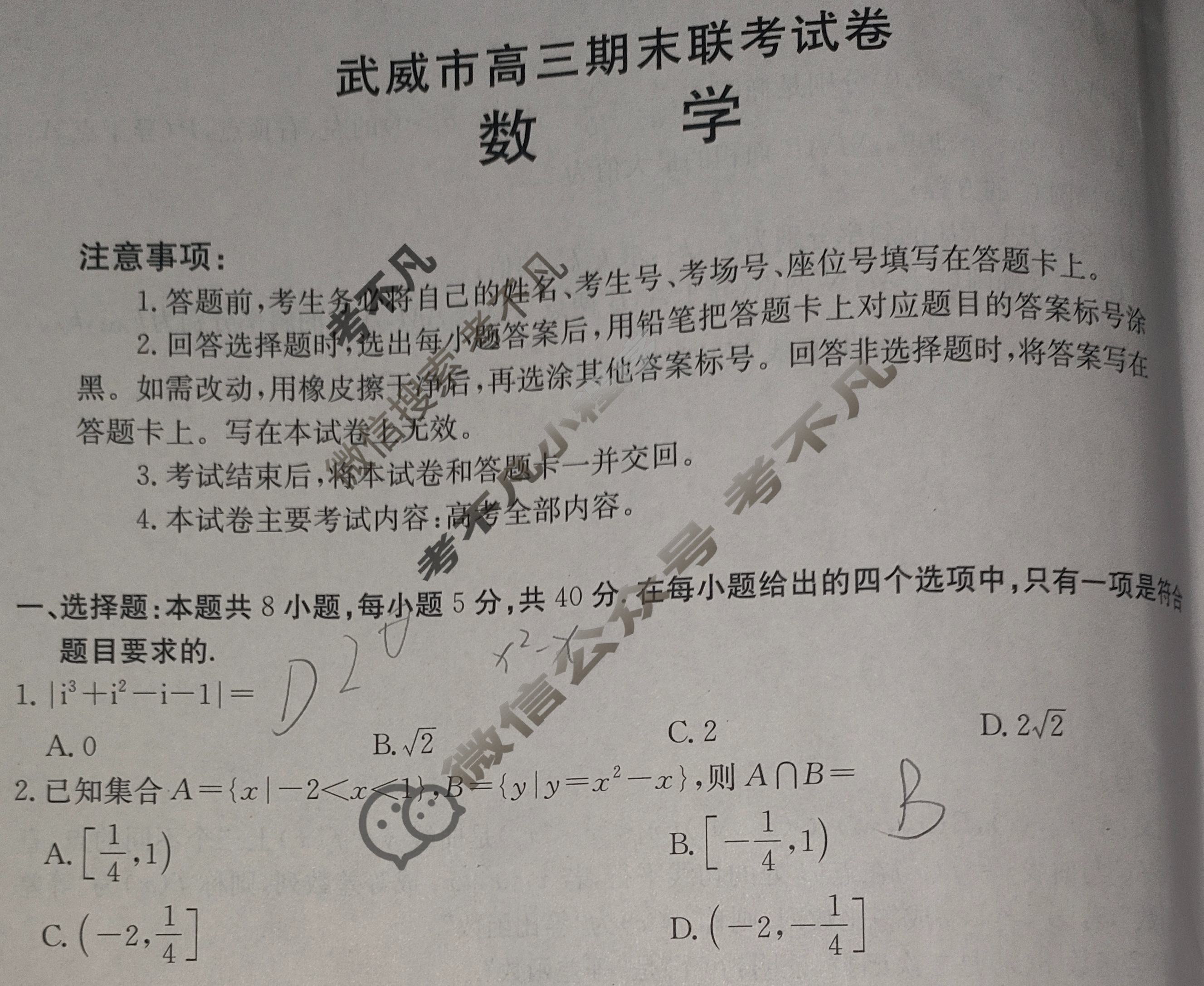 资源详情:甘肃金太阳2025届武威市高三期末联考试卷(1.7)数学试题 中内容包括《甘肃金太阳2025届武威市高三期末联考试卷(1.7)数学试题》请在考不凡上搜索。武威市高三期末联考试卷数学1.答题前,考生务必将自己的姓名、考生号、考场号、座位号填写在答题卡上。注意事项:2回答选择题时,选出每小题答案后,用铅笔把答题卡上对应题日的答案标号黑。如需改动,用橡皮擦干净后,再选涂其他答案标号。回答非选择题时,将答案写在答题卡上。写在本试卷上无效。3.考试结束后,将本试卷和答题卡一并交
