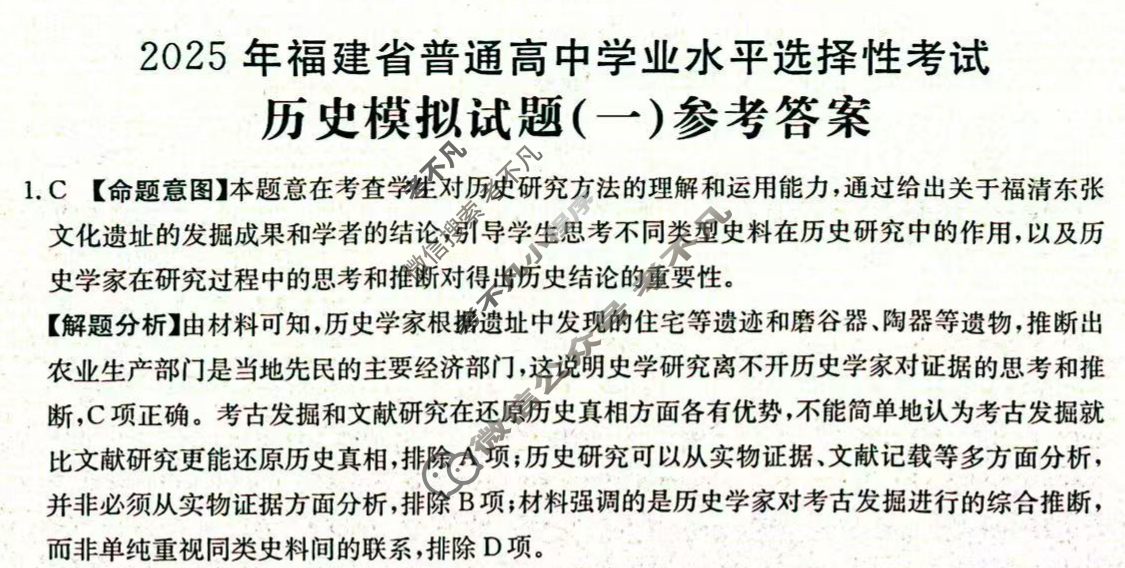 资源详情:2025年福建省普通高中学业水平选择性考试高考模拟示范卷·历史(一)1[25·(新高考)ZX·MNJ·历史·FJ]答案 中内容包括《2025年福建省普通高中学业水平选择性考试高考模拟示范卷·历史(一)1[25·(新高考)ZX·MNJ·历史·FJ]答案》请在考不凡上搜索。全国100所名校高考模拟示范卷众2025年福建省普通高中学业水平选择性考试历史模拟试题(一)参考答案1.C【命题意图】本题意在考查学生对历史研究方法的理解和运用能力,通过给出关于福清东张文化遗址的发掘成果和学者的结论,引导学生思考不同类型史料在历史研究中的作用