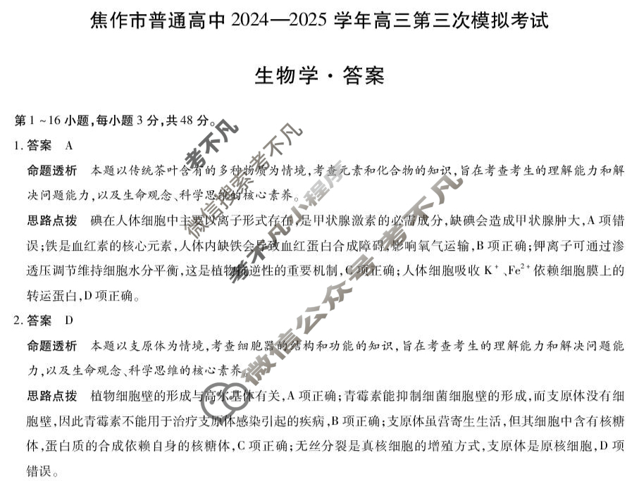 资源详情:[天一大联考]焦作市普通高中2024-2025学年高三第三次模拟考试生物答案 中内容包括《[天一大联考]焦作市普通高中2024-2025学年高三第三次模拟考试生物答案》请在考不凡上搜索。焦作市普通高中2024一2025学年高三第三次模拟考试生物学·答案第1~16小题,每小题3分,共48分。1.答案A命题透析本题以传统茶叶含有的多种物质为情境,考查元素和化合物的知识,旨在考查考生的理解能力和解决问题能力,以及生命观念、科学思维的核心素养。思路点拨碘在人体细胞中主要以离子形式存在,是甲状