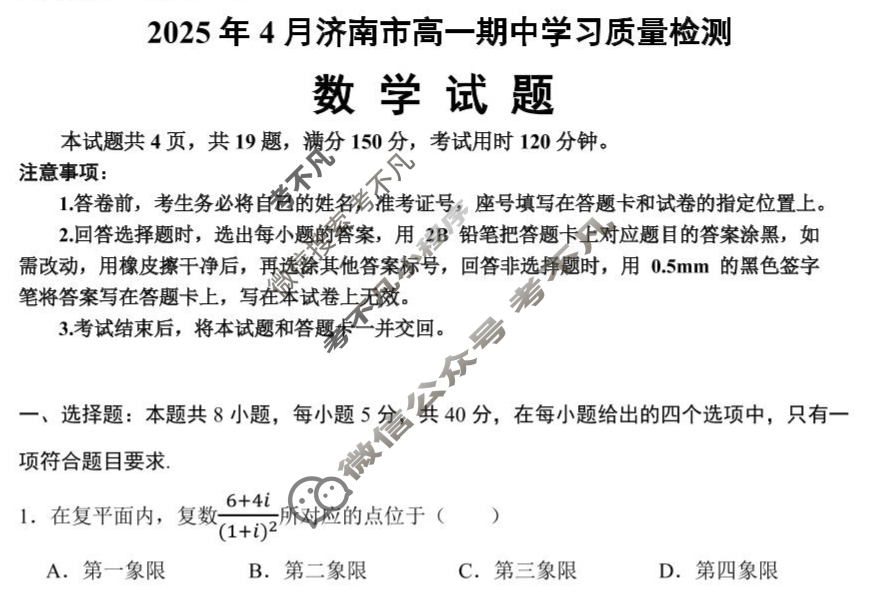 资源详情:2025年4月济南市高一期中学习质量检测数学试题 中内容包括《2025年4月济南市高一期中学习质量检测数学试题》请在考不凡上搜索。绝密★启用并使用完毕前2025年4月济南市高一期中学习质量检测数学试题本试题共4页,共19题,满分150分,考试用时120分钟。注意事项:1答卷前,考生务必将自己的姓名,准考证号,座号填写在答题卡和试卷的指定位置上。2.回答选择题时,选出每小题的答案,用2B铅笔把答题卡上对应题目的答案涂黑,如需改动,用橡皮擦干净后,再选涂其他答