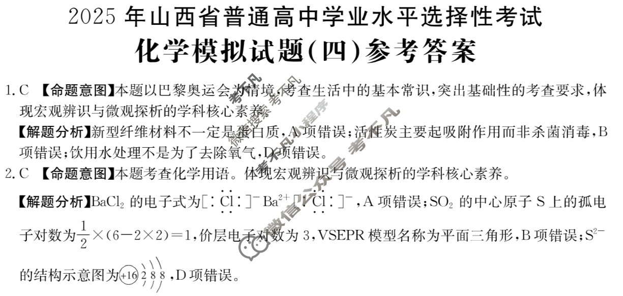 资源详情:2025年山西省普通高中学业水平选择性考试高考模拟示范卷·化学(四)4[25·(新高考)ZX·MNJ·化学·SHX]答案 中内容包括《2025年山西省普通高中学业水平选择性考试高考模拟示范卷·化学(四)4[25·(新高考)ZX·MNJ·化学·SHX]答案》请在考不凡上搜索。全国100所名校高考模拟示范卷公2025年山西省普通高中学业水平选择性考试化学模拟试题(四)参考答案1.C【命题意图】本题以巴黎奥运会为情境,考查生活中的基本常识,突出基础性的考查要求,体现宏观辨识与微观探析的学科核心素养。【解题分析】新型纤维材料不一定是蛋