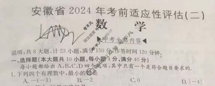 分类:金太阳教育(初中),2024届,九年级考前适应性评估,安徽省评估二7L,数学