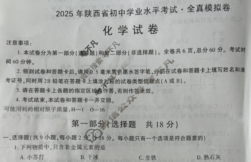 资源详情:[学林教育]2025年陕西省初中学业水平考试·全真模拟卷ET化学B试题 中内容包括《[学林教育]2025年陕西省初中学业水平考试·全真模拟卷ET化学B试题》请在考不凡上搜索。式苍尖型:B2025年陕西省初中学业水平考试·全真模拟卷化学试卷注意事项:1.本试卷分为第一部分(选择题)和第二部分(非选择题)。全卷共6页,总分60分。考试时间60分钟。2.领到试卷和答题卡后,请用0.5毫米黑色墨水签字笔,分别在试卷和答题卡上填写姓名和准考证号,同时用2B铅笔在答题卡上填涂对应的试卷类型