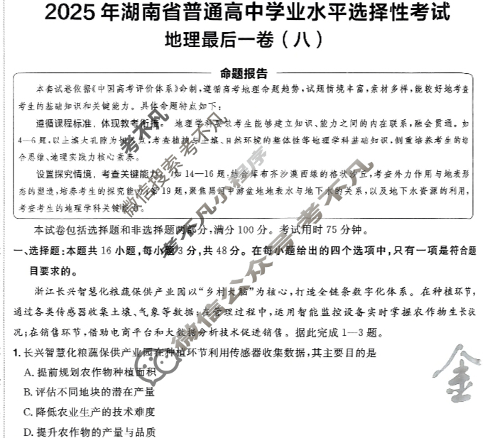 资源详情:[金考卷·百校联盟]2025年湖南省普通高中学业水平选择性考试最后一卷(八)8地理(湖南)试题 中内容包括《[金考卷·百校联盟]2025年湖南省普通高中学业水平选择性考试最后一卷(八)8地理(湖南)试题》请在考不凡上搜索。绝密★启用前2025年湖南省普通高中学业水平选择性考试地理最后一卷(八)命题报告本套试卷做据《中国高考评价体系命制,遵循高考地星命题趋势,试题忻境丰富,亲材多样,能较好地考查考生的基础知识和关键能力。具体余随特点如下:遵循课程标准,体现教考衔接。壅学科要哀考生能够建立知识、能力之间的